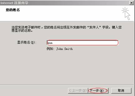 1.运行Outlook Express,Windows系统自动启动Internet连接向导的电子邮件设置。在“显示姓名”后的文本框里键入您想显示的名称,如图: