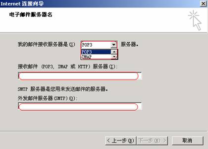 4.在下拉列表中选择服务器类型并在空白处输入发送和接收服务器的名称:61.55.138.198(或mail.xxxx.com),点击下一步,如图:
