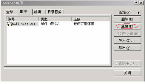 4.下面介绍修改邮件帐号的步骤。在“Internet帐户”窗口中点击“属性(P)”,如图:
