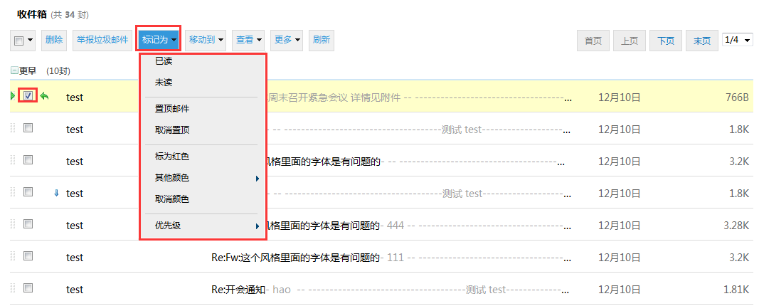 鼠标选中邮件,可以将邮件标记为未读,如图所示。标记为未读功能会使您阅读过的邮件仍然是一封新邮件。一般情况下,您阅读一封邮件后,这封邮件将不再是新邮件,而是一封已读邮件了。但是,您可能还需要处理邮件中提到的一些事情,您想让邮件更加醒目一些,这时您就需要这个功能了。
