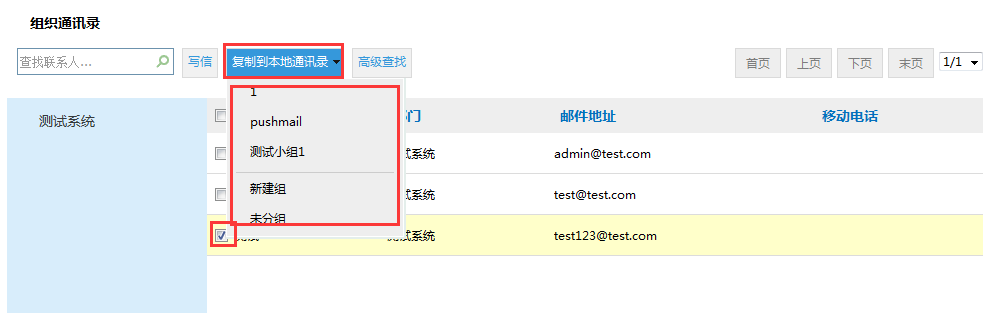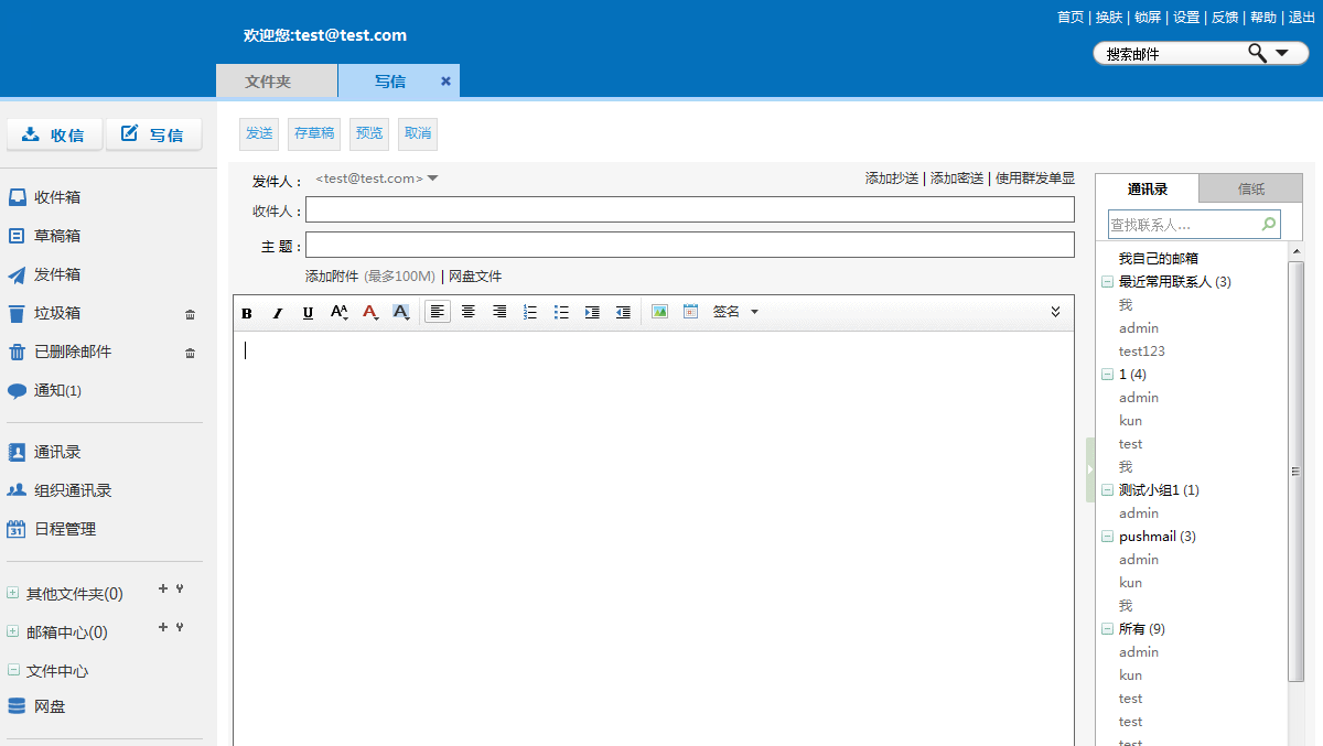 填写抄送人、密送人的email地址,如果通讯录中有抄送人、密送人,可以点击前端的“抄送”、“密送”按钮,从通讯录导入。可填写多个抄送人、密送人,同样以半角英文逗号分隔。