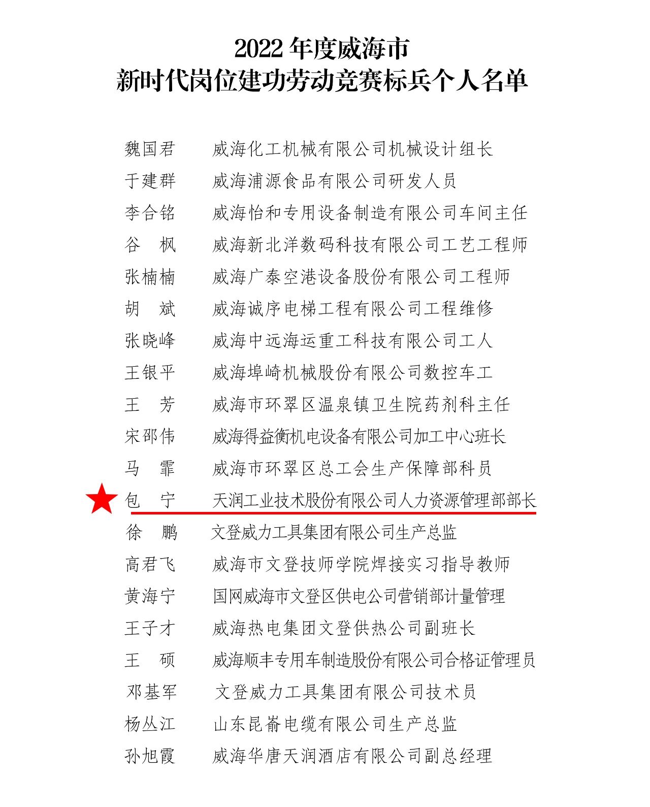 近日,威海市总工会公布2022年度威海市“新时代岗位建功劳动竞赛标兵个人”名单,天润工业技术股份有限公司人力资源管理部部长包宁成功上榜。
