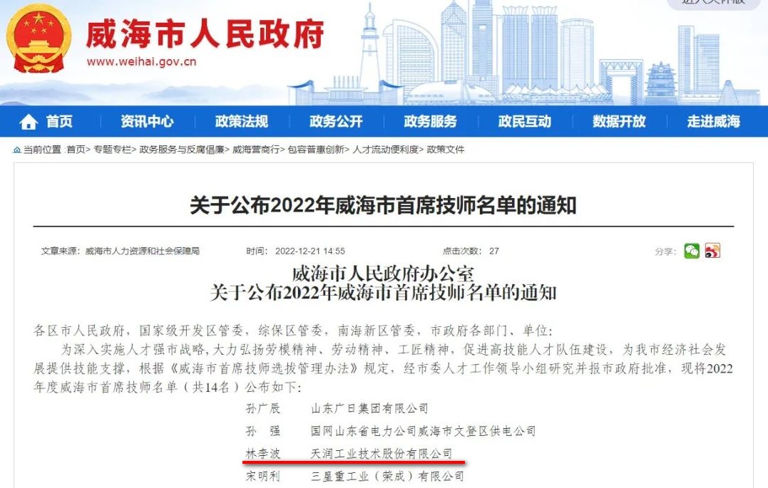 近日,2022年“威海市首席技师”名单公布,我公司员工林李波榜上有名。