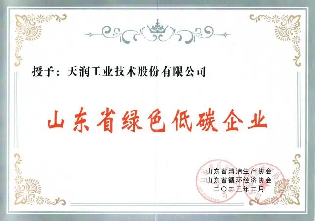 2月21日,由山东省循环经济协会、山东广播电视台主办的“绿色低碳发展、循环经济先行”——2022山东省循环经济年度盛典在济南举行,天润工业技术股份有限公司作为首批“山东省绿色低碳企业”参加会议并上台领奖。