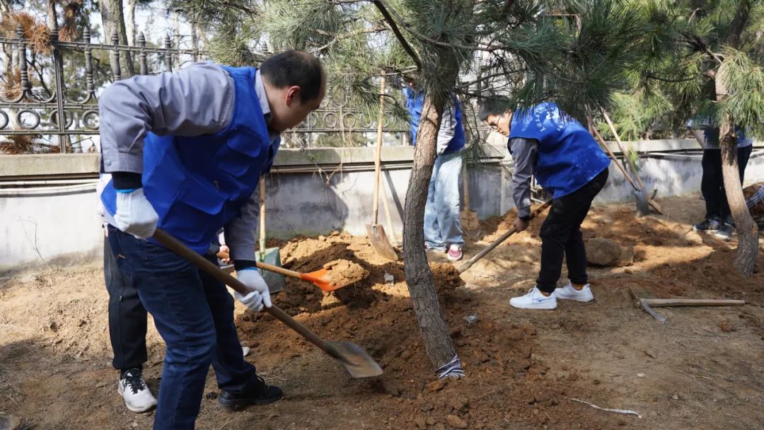 在植树现场,远远就能看到志愿者们忙碌的身影。他们抡起铁镐,挥动铁锨,共同喊着口号埋下新植入的树木,然后踩实土壤。分工有序,配合默契,不一会就将一排排树木种植了起来。