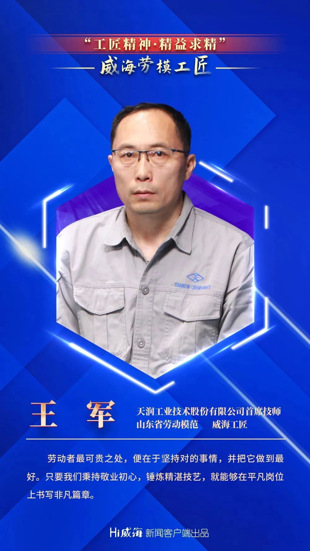 近日,威海市政府新闻办举行“大抓经济 大抓基层 大抓落实”典型代表记者见面会,天润工业技术股份有限公司首席技师、山东省劳动模范、威海工匠王军被选为劳模工匠代表分享了自己的奋斗故事。