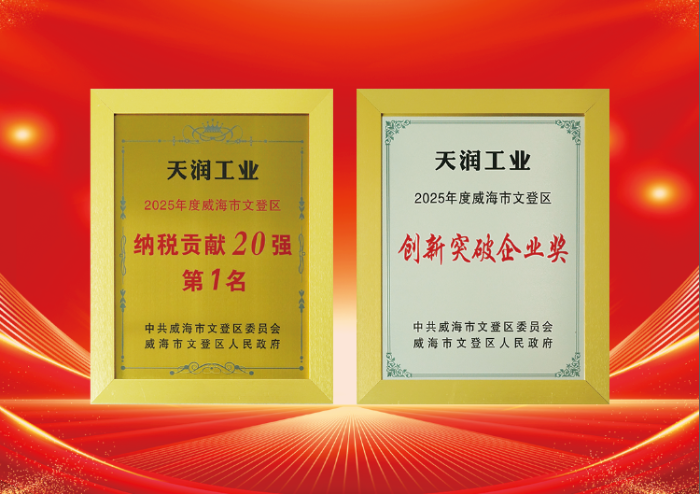 2月25日,在文登区2026年工作动员大会上,天润工业技术股份有限公司再获殊荣,成功荣获文登区2025年度“纳税贡献20强第1名”和“创新突破企业奖”。